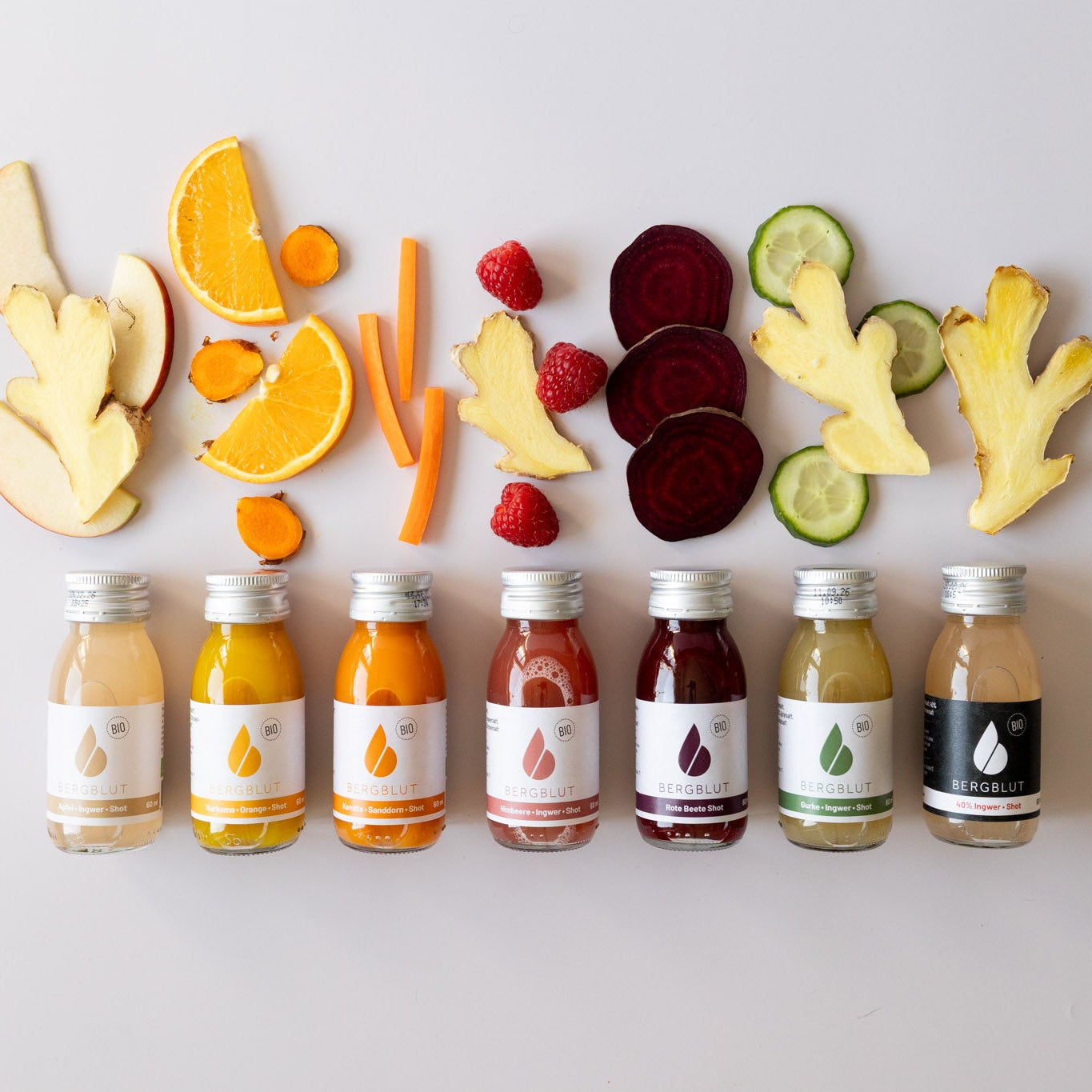 With our 9-day BIO Flex program , we help you to start a healthier phase of your life and overcome your inner laziness. The program is based on the interval fasting principle and thus offers you a lot of flexibility in your everyday life. At the same time, the Bergblut BIO juices flood your body with a variety of vitamins and nutrients and give you the energy you need. One solid meal is allowed per day and is rounded off with 3 colorful BIO juices (330ml each) and an BIO Bergshot (80ml each). A description of the 9-day program is included with the colorful juice selection.